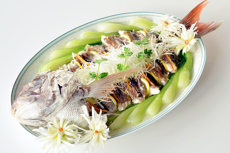 - 鯛が蒸し上がったら、チンゲンサイ、白髪ネギ、パクチーを添える。